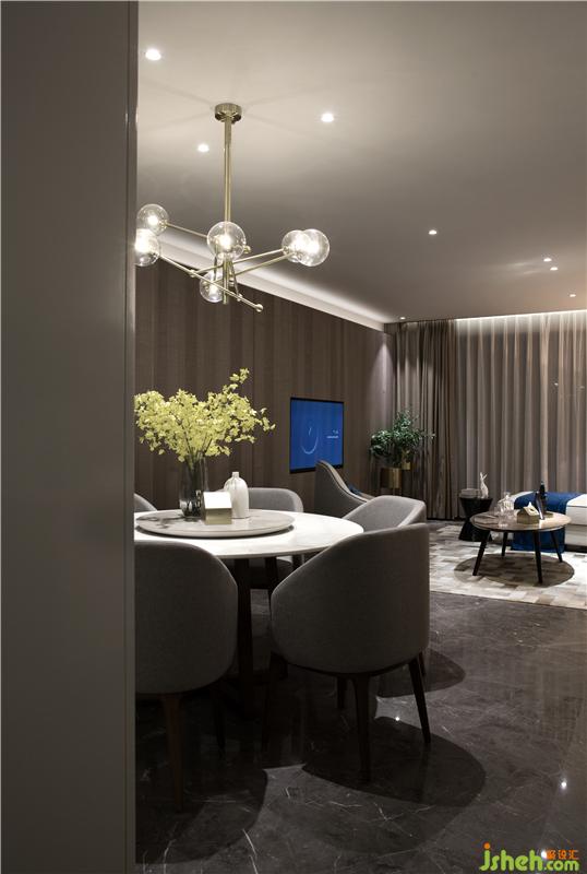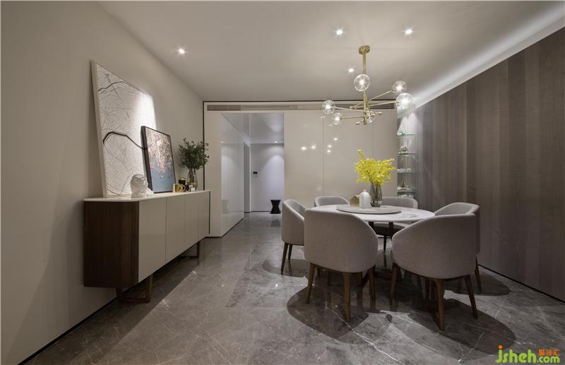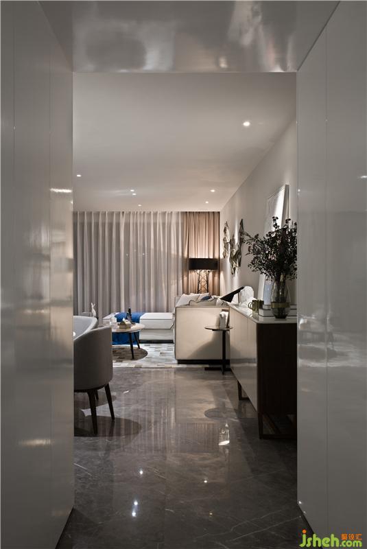以電視墻隔開活動(dòng)區(qū)和休息區(qū),為了增大活動(dòng)區(qū)的視覺(jué)空間,活動(dòng)區(qū)的門全部以隱藏的形式。從客廳往廚房方向看,玄關(guān)和廚房融為一體,形成一個(gè)白色的盒子,成了這個(gè)空間的視覺(jué)焦點(diǎn),而活動(dòng)區(qū)的所有空調(diào)設(shè)備全部隱藏在白色盒子內(nèi),最大限度的抬高客廳及餐廳的層高,避免壓抑。電視背景墻與休息區(qū)入門及餐廳背景墻做成一體,讓活動(dòng)區(qū)更加整體。室內(nèi)設(shè)計(jì)師