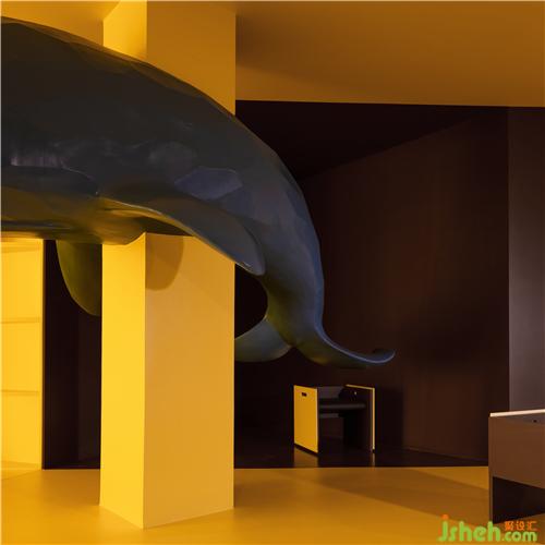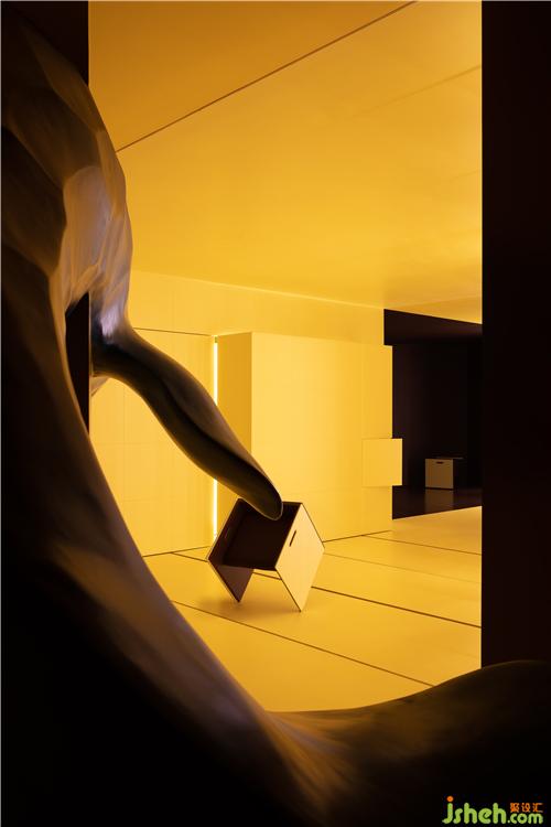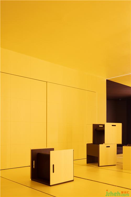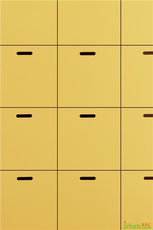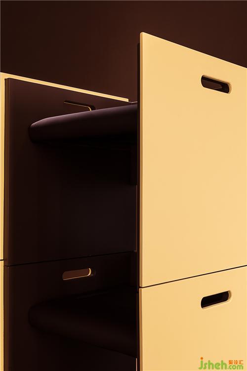 在平滑墻面的另一側(cè),隱藏著六個推拉展示柜和分享會使用的凳子,展現(xiàn)了強(qiáng)大的收納和展示功能。凳子融合了產(chǎn)品、功能、美學(xué)藝術(shù)為一體的產(chǎn)物,看上去就像以直覺和想象力水到渠成的抽象派藝術(shù),是這個空間不可或缺的移動元素。