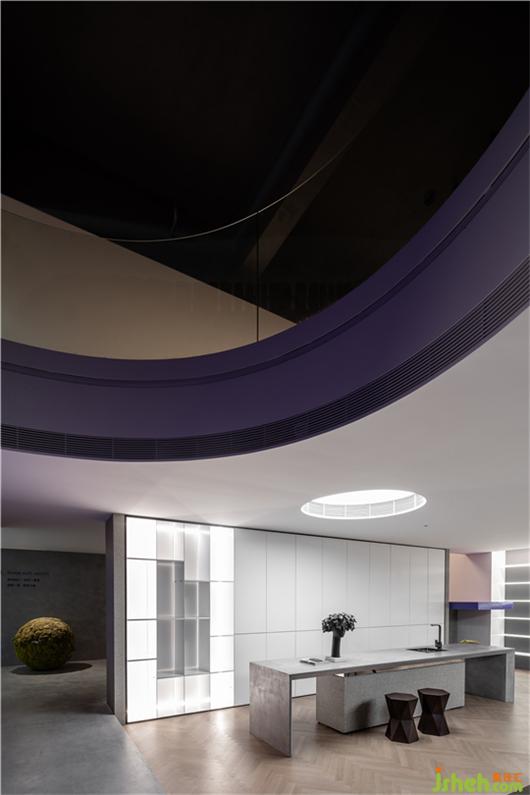 因為這片紫色的屏風(fēng),軟裝館得以在商場中有了相對的“私密性”,其中的溝通、創(chuàng)意、會談,有了不被打擾的可能。色彩是運(yùn)動獨立的態(tài)度,運(yùn)動是色彩保持清醒的自知。展廳設(shè)計伴隨著音樂律動,也可以感應(yīng)人流變換舞動的節(jié)奏和頻率。當(dāng)二者互為聯(lián)系,即刻產(chǎn)生新的派系,形成自由呼吸的新有機(jī)體。