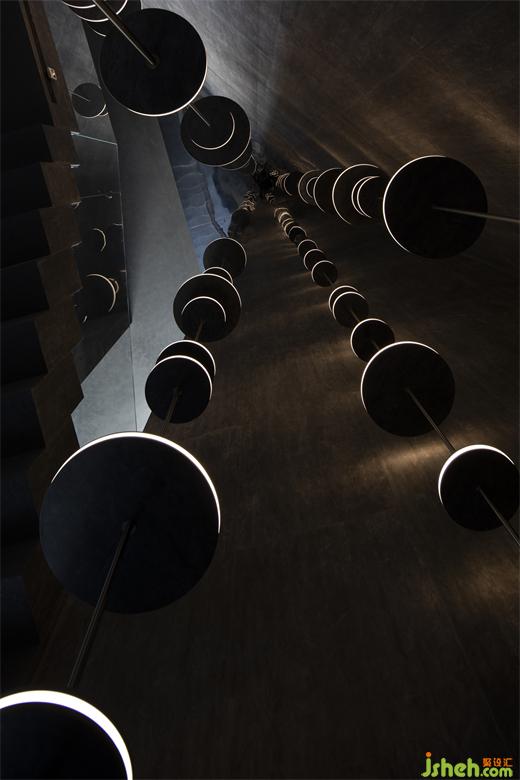 如:展廳一角的磚貼面的圓盤燈,它們以散落的獨立個體集結成章,有序串聯(lián)成流動的圓盤燈束,由挑空的穹頂傾瀉而下,瀲滟了整個原生態(tài)的空間氛圍。