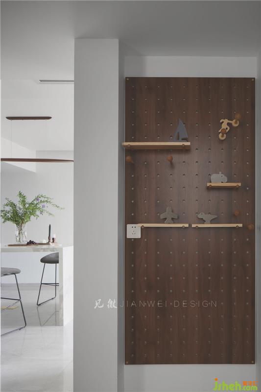過道的墻面裝上洞洞板,可以隨意調(diào)配掛件與層板,很不錯的收納設(shè)計。