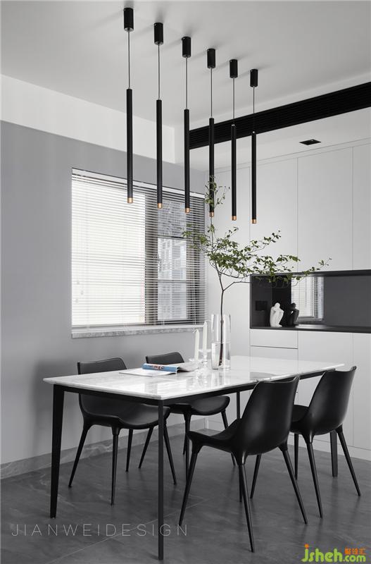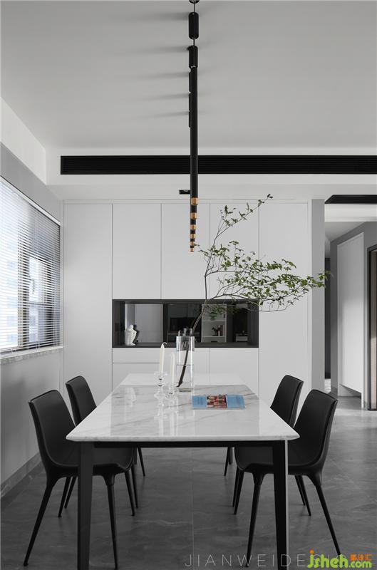 整個餐廳空間為簡約的開敞設計,白色的大理石桌面,搭配不同黑色肌理的桌椅與吊燈,創(chuàng)造出空間的輪廓與光影層疊的質(zhì)感。收納柜和過道柜的加入,增加了實用性,提供了豐富、多變的空間選擇,也創(chuàng)造了更多未來的可能性,同時提升了空間感受。裝修設計