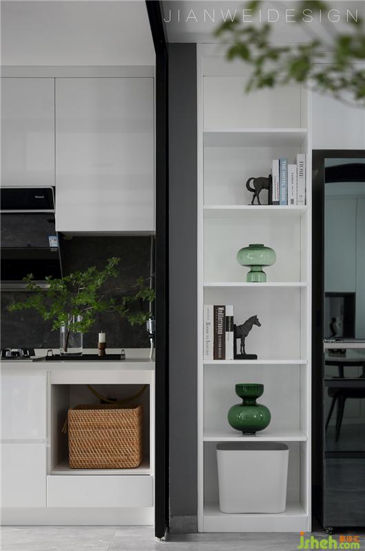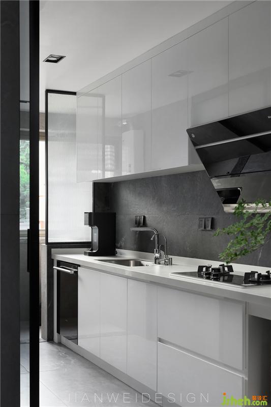 廚房原本的設計不合理,動線不順暢。設計師在廚房做了90度開合的吊軌移門,最大化保障了廚房和外部空間的融合。開放式和半開放模式隨時切換,同時也可以保留封閉廚房的功能性。潔白的櫥柜,潔白的大理石臺面,純粹簡單,干凈又整潔。裝修設計