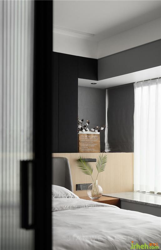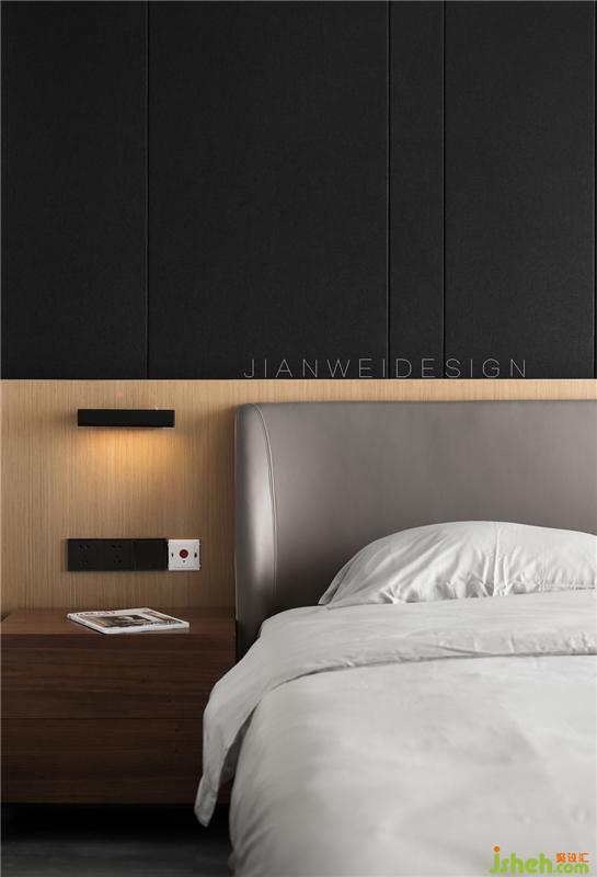 在臥室里,由淺入深的灰色搭配營造出豐富的層次,簡單的黃色燈光帶一圈弧度,點綴著原木色的墻面,讓素色的空間也不覺單調(diào)。大面積的大理石飄窗,帶來寬闊明亮的視野。拉長了床頭背景與飄窗為一體,使得凸窗無法影響床頭背景的整體感。