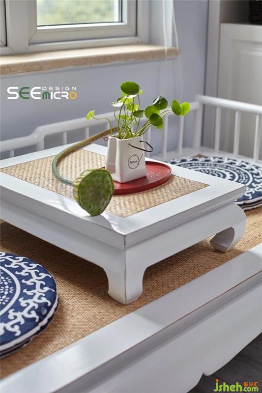沿承其他空間區(qū)域的清新色調(diào),設(shè)計師以整面的素白書柜與淺藍(lán)色的墻壁將整個書房處理得更加通透。長條形木質(zhì)地板將視覺空間往里延伸,盡頭的羅漢床上以一個蓮蓬、兩席蒲團(tuán)營造出簡約而不簡單的幾許禪意,半掩的窗則最大限度的為書房引進(jìn)了自然光。