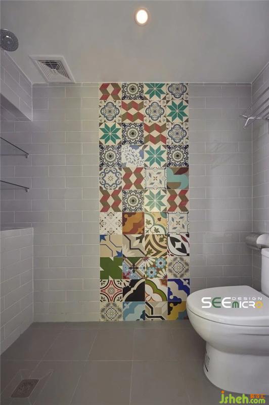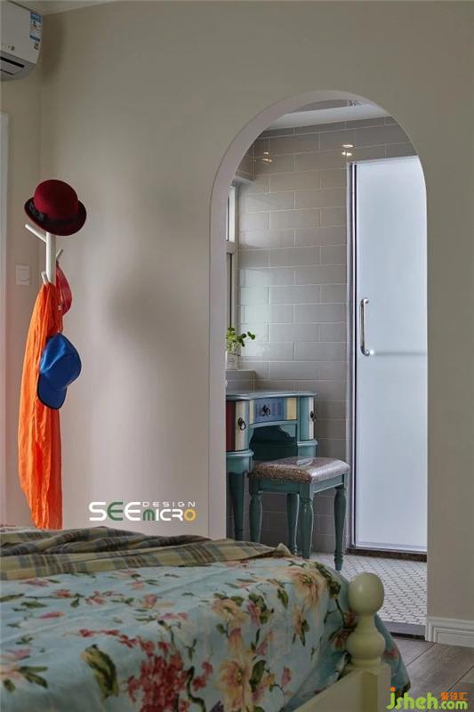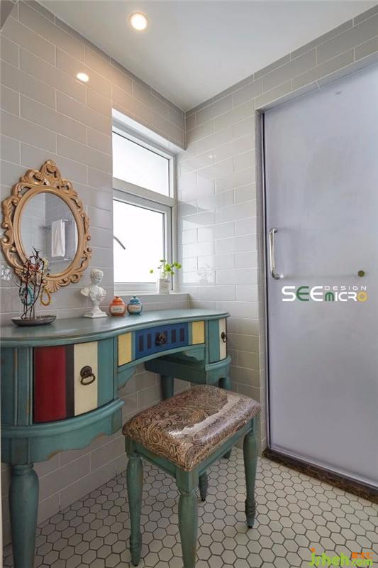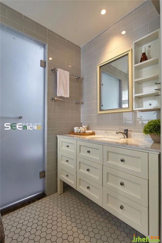 從主臥的一扇拱門進去便是主衛(wèi)所在之處,主衛(wèi)做了干濕分區(qū),外面是美式風格飽滿的梳妝臺與洗漱區(qū),里面是沖涼區(qū),中間以一扇磨砂玻璃門做隔斷。主衛(wèi)干區(qū)一改其他區(qū)域的大塊地磚,選用六邊形馬賽克瓷磚使整個空間美感升級;推開磨砂玻璃門進入濕區(qū),則可見到一面不規(guī)則鋪貼的花磚,藝術(shù)感十足。裝修設計