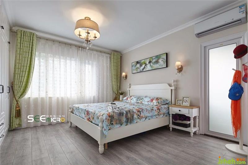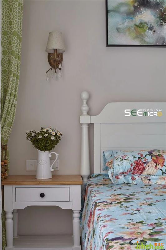 由于女主人喜歡小清新風格,因此主臥的整體設計風格偏文藝——素雅的嵌入式衣柜、簡約舒適的實木大床、寓意美好的印花床品、線條流暢的淡綠色落地窗簾與墻上一幅耐人尋味的抽象畫,整個空間以舒展而優(yōu)美的線條回歸初心的美好。裝修設計