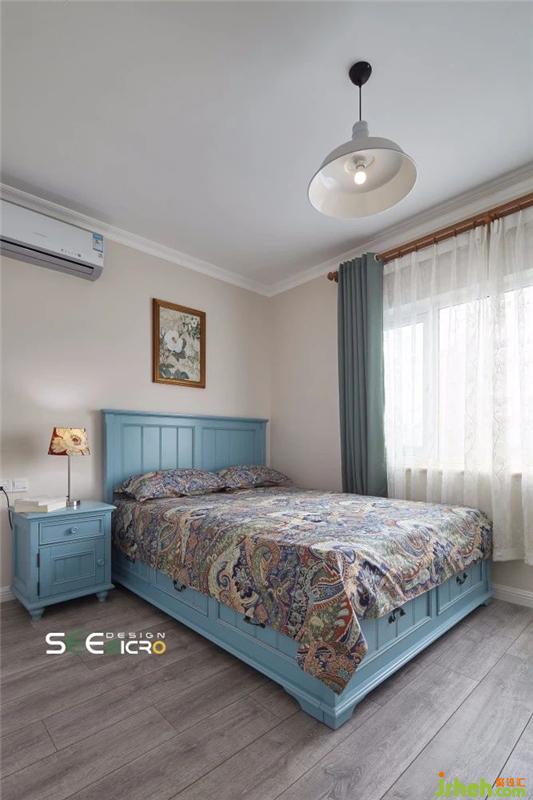 主人母親鐘情藍色,特意選了一張湛藍的美式大床,與邊上床頭柜為同一色系,搭上一襲民族風印花床單,自成一景。帶抽屜的大床不僅美觀,且能夠滿足儲物需求,夏日到了便可將棉被等物件收納起來。床頭柜上的花色燈罩與墻上的壁畫主體相互呼應,無意間便點綴了視覺空間。