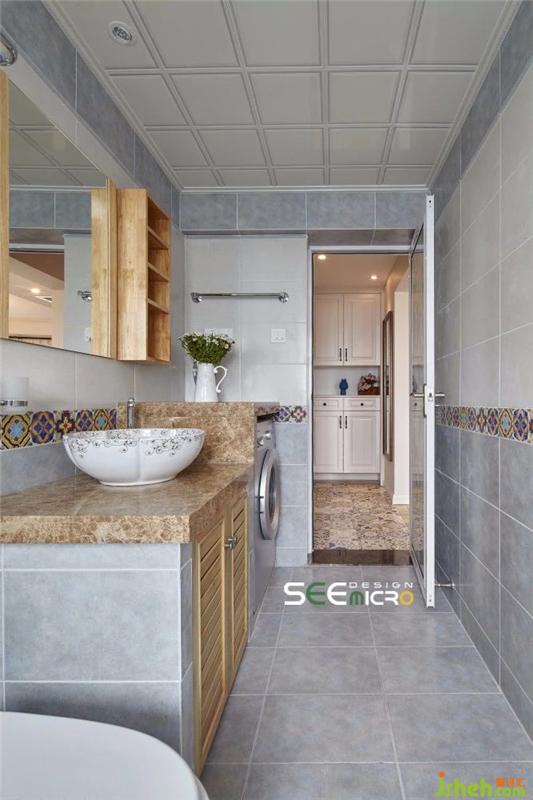 大理石瓷磚的大面積使用讓衛(wèi)浴空間的日常打理更加輕松,灰色系的選擇則削減了衛(wèi)浴空間的狹長感,讓整個區(qū)域更簡潔大氣。洗衣機洗手盆做了一體式設計,既整齊又節(jié)省空間;一扇玻璃門,便將干濕兩個區(qū)域分隔開來。