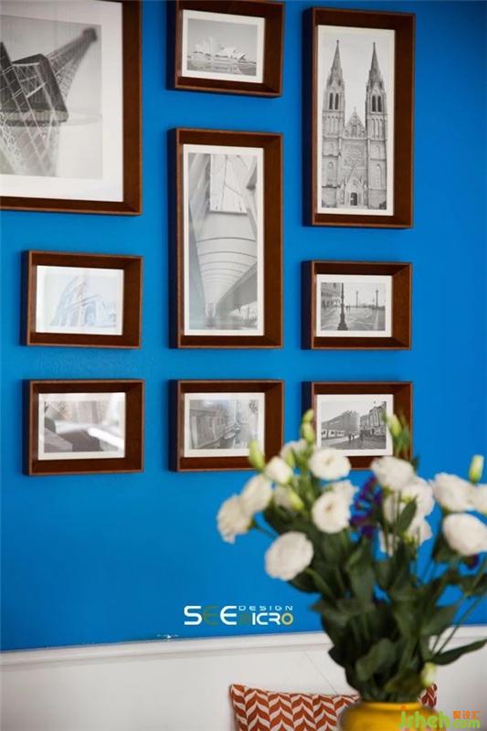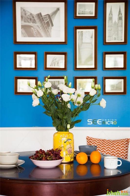 客餐廳空間以通透式設(shè)計的手法形成空間連貫性,并保證了餐廳的采光。藍色背景墻與客廳呼應(yīng),建筑掛畫又給空間注入了一抹亟待探尋的故事感。裝修設(shè)計