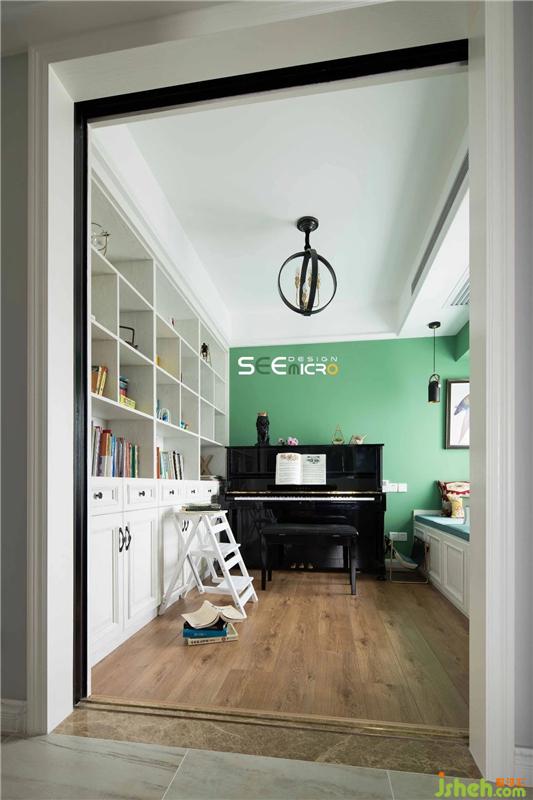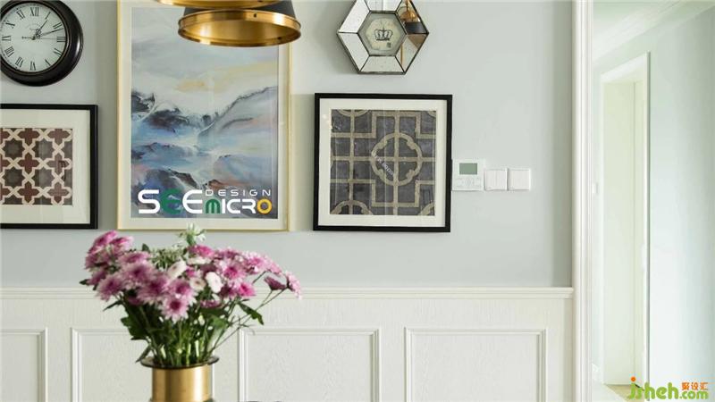 由于整個(gè)空間是淺色系的基調(diào),所以在家具的選擇上選擇以深色皮質(zhì)和金屬吊燈的搭配來(lái)做為空間的點(diǎn)綴。桃木色桌腿與白色大理石臺(tái)面搭配,長(zhǎng)條個(gè)性皮質(zhì)沙發(fā)與綠色皮單椅相結(jié)合則成了餐廳的經(jīng)典。抽象壁畫和幾何圖壁畫提升了整個(gè)餐廳空間的時(shí)尚感, 使整個(gè)餐廳多了幾分生動(dòng)與暖意,豐富的層次之間盡顯輕奢之優(yōu)雅魅力。裝修設(shè)計(jì)