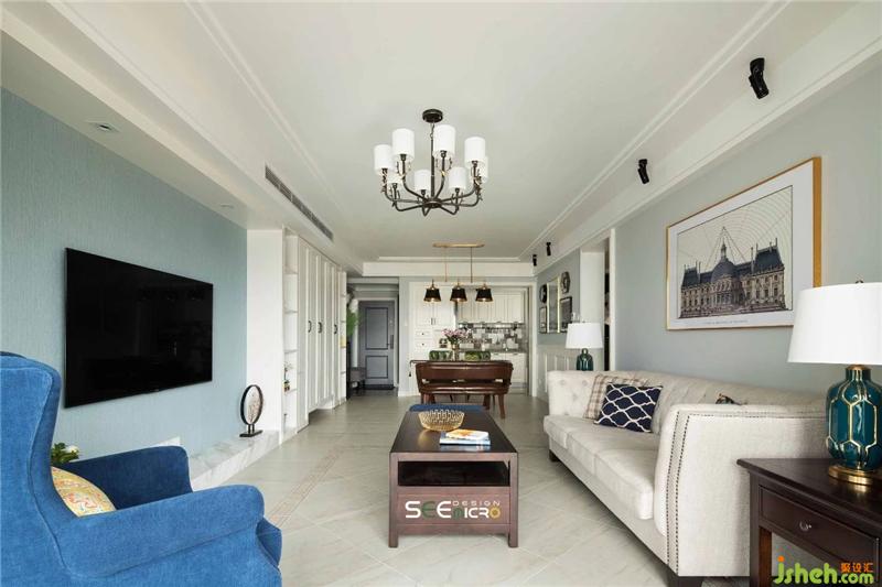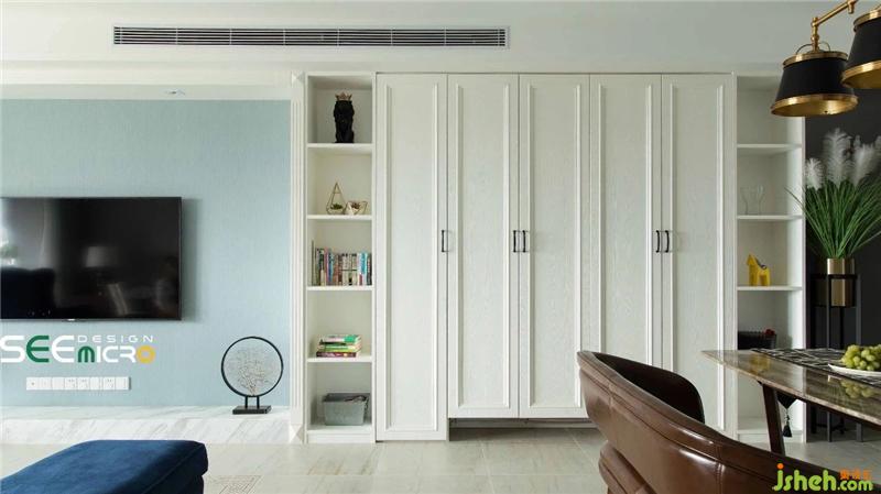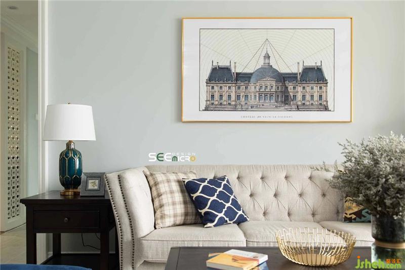 客廳的整體顏色,是通過藏藍(lán)色沙發(fā)和鐵藝質(zhì)感的裝飾來(lái)打破空間的沉悶感。整體氛圍比較明亮,清爽,頗具品質(zhì)感。通過一張壁畫豐富了整個(gè)空間的層次感;給家的氛圍增添幾分設(shè)計(jì)感。客廳墻面整體柜增加了美式經(jīng)典的線條感,沙發(fā)輕奢造型感搭配胡桃木色的茶幾,精致又不失單調(diào),通過窗簾、軟裝飾品的呼應(yīng)讓整個(gè)空間突出了質(zhì)感和舒適感。裝修設(shè)計(jì)