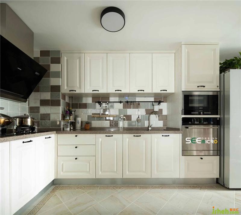 L型白色櫥柜收納柜 ,優(yōu)雅與穩(wěn)重并存,操作臺(tái)區(qū)和收納區(qū)分割明確,美學(xué)風(fēng)尚的修飾締造出整體空間律動(dòng)的層次。裝修設(shè)計(jì)
