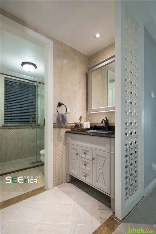 公衛(wèi)干濕分區(qū),輕盈質(zhì)感與舒適度相結(jié)合,細(xì)節(jié)的設(shè)計(jì)給人以干凈、簡(jiǎn)潔之美;白色鏤空屏風(fēng)與灰色洗手臺(tái)的搭配展現(xiàn)出美式風(fēng)格的素雅、舒適,透露出明快清新的流暢感。裝修設(shè)計(jì)