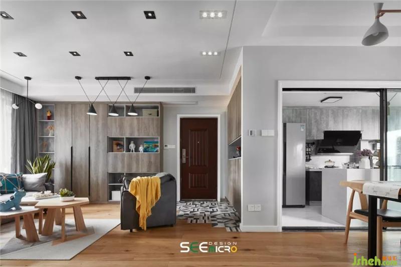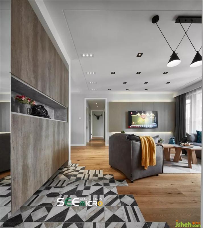 開門,不規(guī)則幾何圖形入戶地磚和原木地板的結(jié)合打造出具有藝術美感的設計形態(tài),讓整個地面更有靈動性。裝修設計