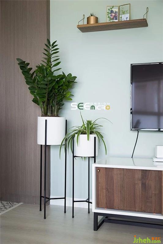 電視柜一側的金錢樹和折鶴蘭,為入戶和客廳空間增加了一抹自然氣息,極簡線條組成的圓柱形花架既不占據(jù)空間,又極具視覺張力。