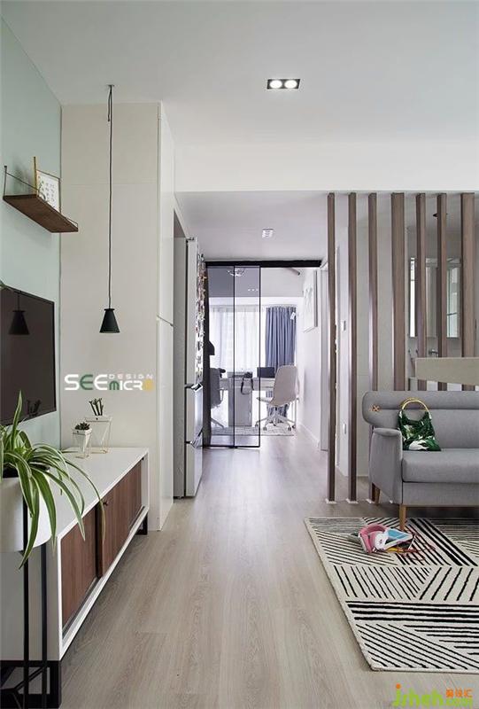 電視柜另一側設計了一個擁有超強收納量的隱形儲物柜,這里不僅是主人各種居家物件的安放之地,還成為“收納冰箱”的好去處!