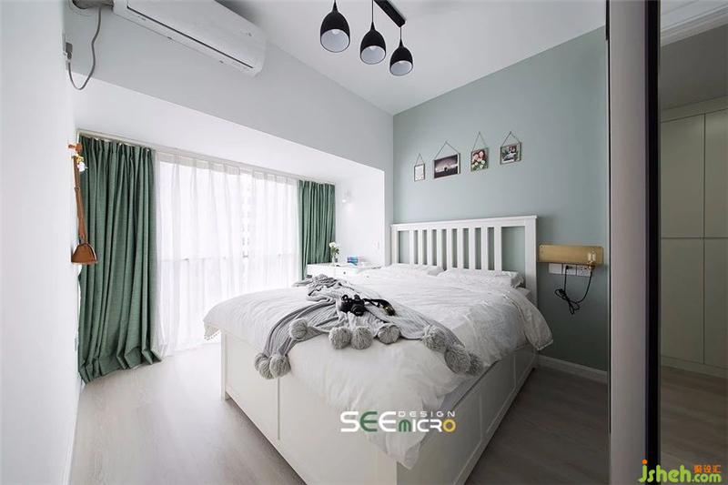 【梳妝臺+床頭柜】變身更有青春感且收納更強大的梳妝柜,搭配灰綠色的落地窗簾和高顏值的梳妝凳,這個位置立即變身女主人私享的小天地。裝修設計