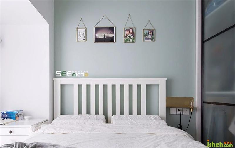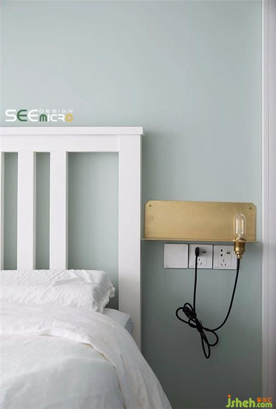 由于床離衣柜較近,所以這一側也沒有采用傳統(tǒng)的床頭柜,而是以非常有質感的銅質層板架替代之,同時再將衣柜作推拉門設計,這樣的設計與布置組合就完全消除了小空間的煩惱。