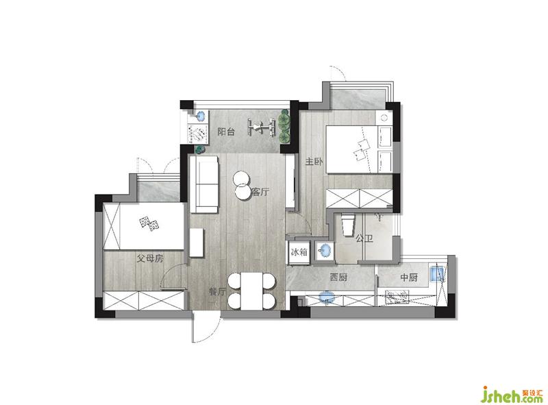 2.將原有洗衣機(jī)的位置改為中廚,以玻璃門間隔,向外增加西廚,提高采光和實(shí)用性,使區(qū)域布局規(guī)范化