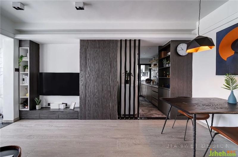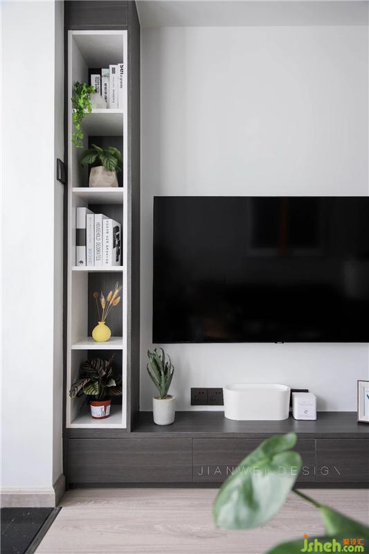 主臥門采用了隱形門設(shè)計(jì),與電視柜融為一體,左側(cè)的收納展示柜可容納不同尺寸的收藏。