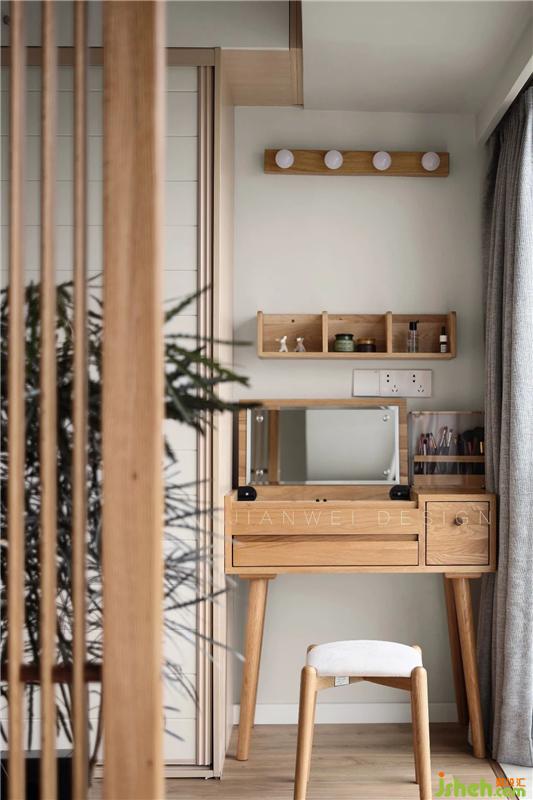 翻板化妝臺(tái),避免鏡子對(duì)著床頭,拿取方便。補(bǔ)光燈也是水電階段設(shè)計(jì)師就預(yù)料安排了的。開放格小層板也是恰到好處的好用(墻裂安利)