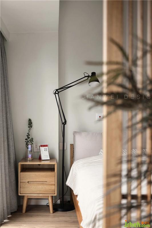 簡(jiǎn)約的線條,方形圓形互換,圓形木紋壁燈裝飾摒棄傳統(tǒng)背景墻的做法,增加空間氛圍。