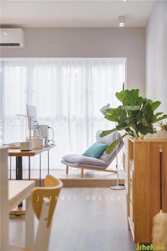 原南面陽臺,封窗并進室內(nèi),做成地臺。這里的設定是一塊多功能區(qū),目前作為屋主休息放松的地方。而在未來baby到來以后,這個高度僅為12cm的地臺就可以完美化身為親子區(qū)。鋪塊游戲毯,寶寶就可以在上面練習翻身,爬行,走路......