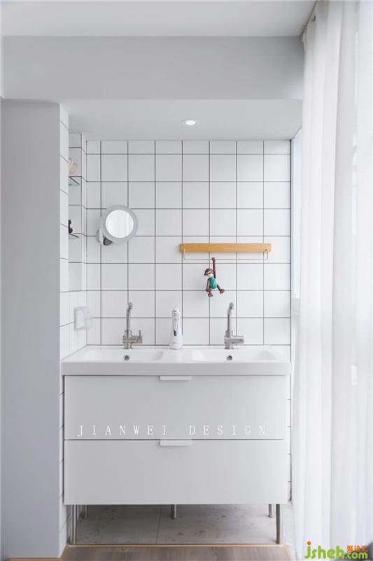 地臺左側打造出一個洗漱區(qū),用以彌補原衛(wèi)生間面積的不足。宜家的雙盆浴柜要強烈推薦一下,1.2米即能擁有雙人雙盆,小空間也能輕松享有“大戶”的奢侈需求。雙抽屜浴柜和左側的玻璃隔板,充分滿足了浴室的收納需求。小猴哥勾住的黃銅掛件,成了一件顏值和實用并駕齊驅的毛巾架。