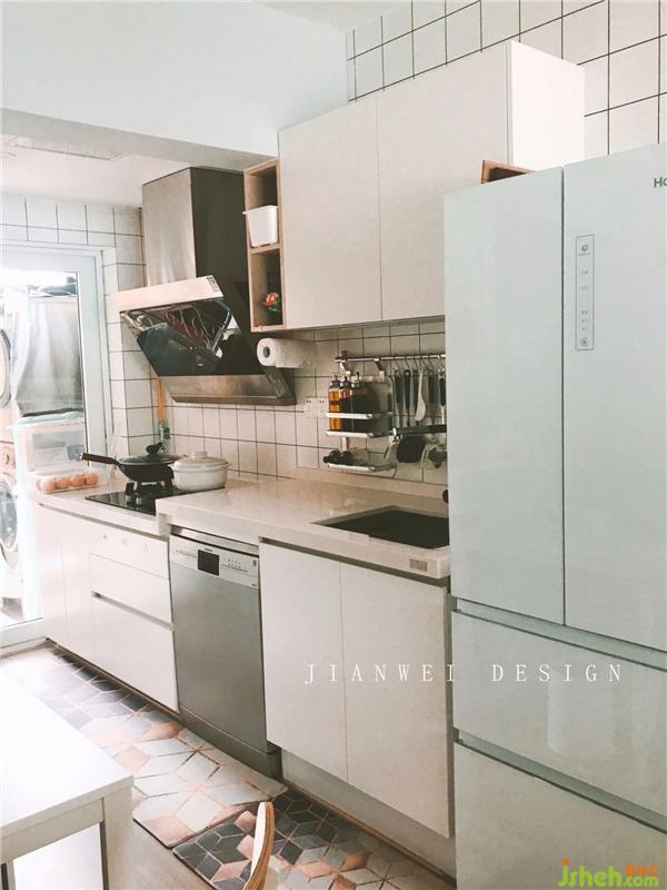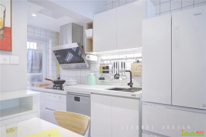 改造后的廚房,由于沒有隔墻的阻擋,空間雖小卻通透亮堂。走動通道留約1米,確保屋主在這個迷你廚房還能擁有舒適的動線空間。并根據(jù)屋主的生活習慣,做了高低臺面??臻g雖然有限,但備菜區(qū)和置菜區(qū)還是留足了所需面積。同時,為了不占用有限的臺面面積,幾乎所有廚房用品都全部上墻。內(nèi)嵌的SIEMENS洗碗機已躋身進入屋主的最愛電器Top3。裝修設計