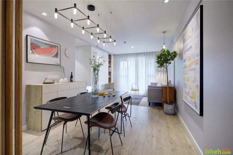 餐廳與客廳之間無(wú)界限化,餐桌上方的吊燈如同燭光點(diǎn)點(diǎn),是個(gè)營(yíng)造聚餐氛圍的好物~