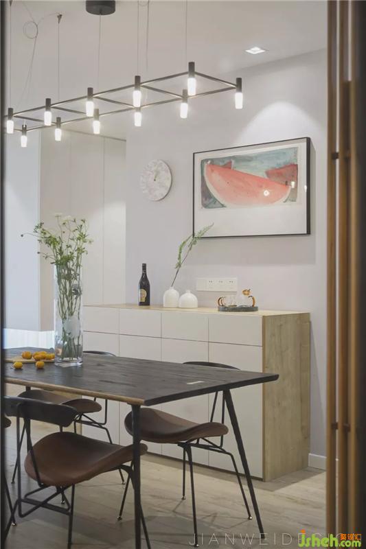 一側(cè)的餐邊柜是保證整潔餐桌的必備收納神器,臺(tái)面上預(yù)留的多孔電源,方便一切家庭小電器的靈活使用。墻上的裝飾畫(huà)給人一種“得閑飲茶吃瓜”的放松感。