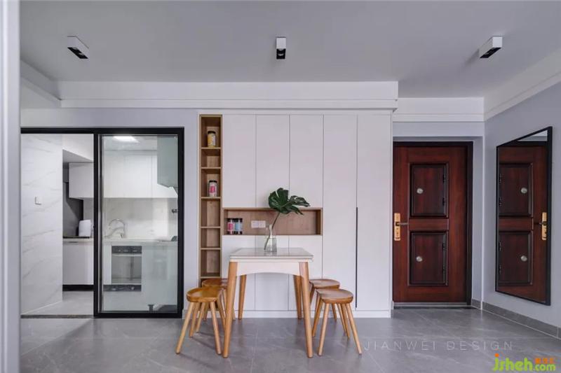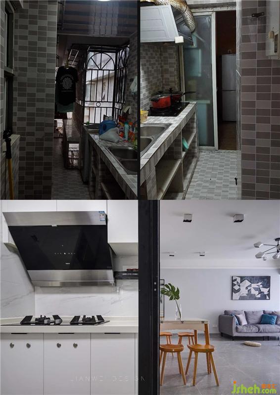 黑色的透明移門阻擋了廚房油煙進(jìn)入客餐廳區(qū)域,也將光線更好得引入進(jìn)了廚房,改造后的廚房已經(jīng)沒有了狹窄空間的壓迫感。室內(nèi)設(shè)計(jì)師