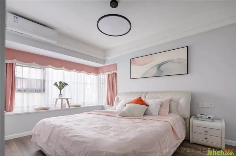 主臥延續(xù)了全屋的色調(diào),并增加了淡粉色的比例,讓空間更加柔軟。軟裝的色調(diào)選擇,無一不是為了讓整個(gè)空間更柔和。室內(nèi)設(shè)計(jì)師