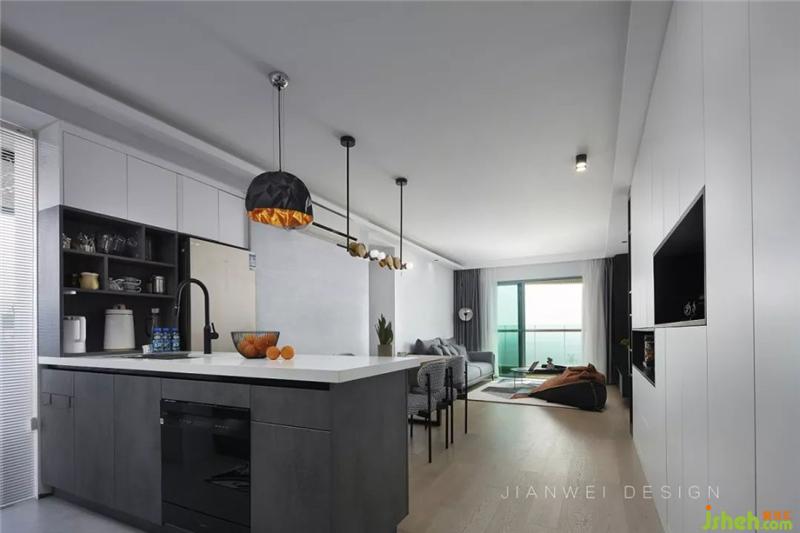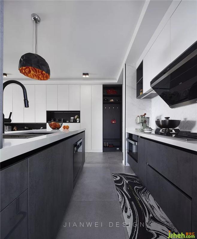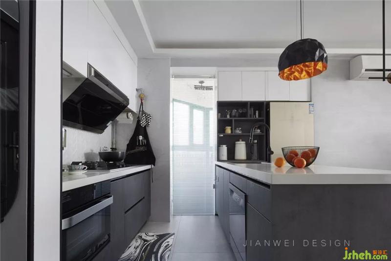 白色巖板臺(tái)面配以帶有暗紋的灰黑色櫥柜,提高了廚房的現(xiàn)代感和酷炫感。得益于電器的內(nèi)嵌和小電器柜,操作臺(tái)面達(dá)到了最大化的使用。冰箱嵌在櫥柜預(yù)留好的位置里,節(jié)省空間且提高了空間的整體性。