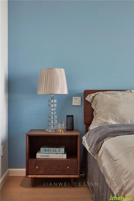 安靜的天空藍(lán)背景墻,與灰藍(lán)的天絲床品一起打造了一個(gè)舒適的睡眠區(qū)。左側(cè)的衣柜以假亂真,與墻體融合在了一起。