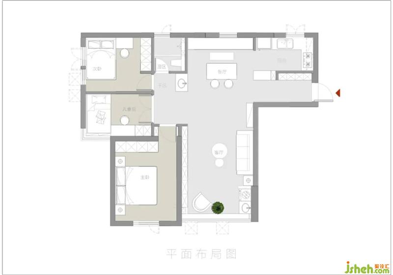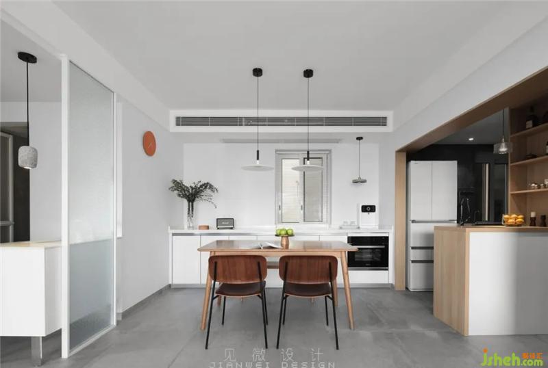 衛(wèi)生間干濕分區(qū),廚房餐廳布局改造,將陽臺擴(kuò)大到客廳。小孩房改成雙開門,進(jìn)一步擴(kuò)大空間對流,增加門廳收納的同時(shí),吧臺的融入可以很好地改善原本空間狹小冗長的問題。