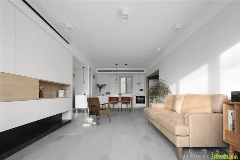 一個(gè)舒適的家才能讓人留戀不舍,大面積的水泥瓷磚平鋪,靈感來自于安藤忠雄,大量的白色x原木色交錯(cuò),給人滿滿的閑適感。