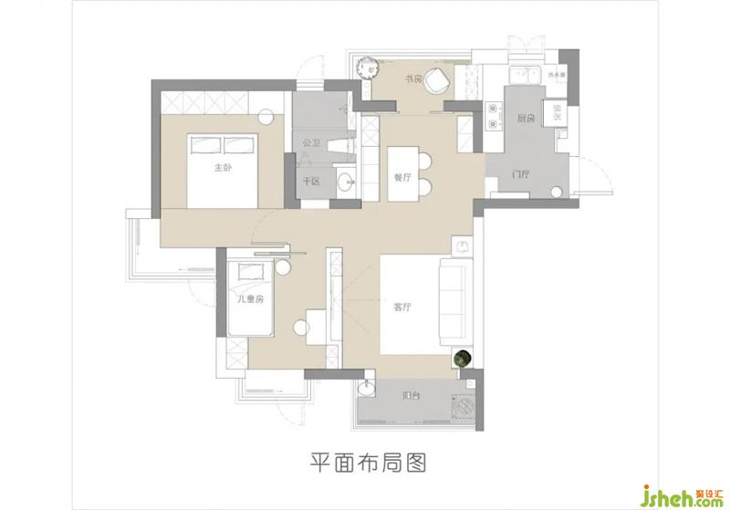 ①將原本陽(yáng)臺(tái)的位置改為書(shū)房,由原本的兩居室變成三居室。