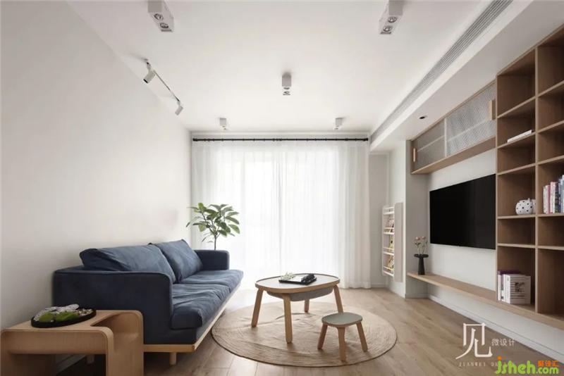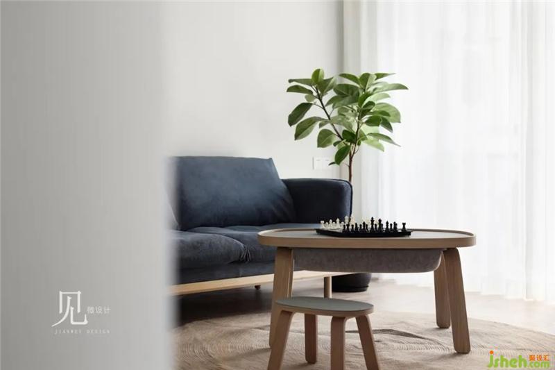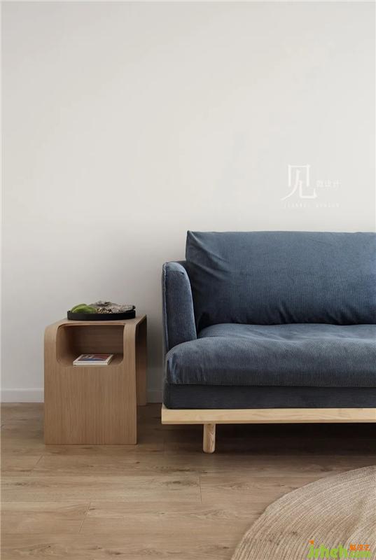 客廳整體色調(diào)以白色、原木色為主,加以低飽和度的灰藍(lán)色進(jìn)行點(diǎn)綴。室內(nèi)設(shè)計(jì)師