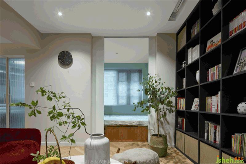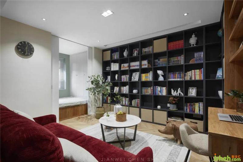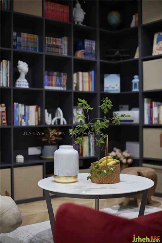 客廳想營造書屋讀書角的氛圍,大兩整面的書柜,收藏量驚人,隨手拿一本讀物,便可幸福地沉浸于書的海洋。