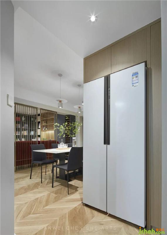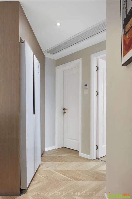 利用過道墻面打造了一個實用型的立柜,鑲嵌式冰箱與立柜和整體的裝修風(fēng)格融為一體,美觀的同時還節(jié)省了更多空間。室內(nèi)設(shè)計師