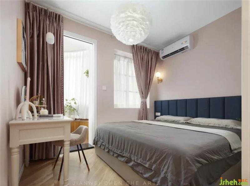 室內(nèi)設(shè)計(jì)極簡,粉色和藍(lán)色搭配的清新色調(diào)看起來既溫馨又不失浪漫,地面采用人字拼接實(shí)木,簡約溫潤自然。內(nèi)部增加了白色儲(chǔ)藏柜,方便衣物的儲(chǔ)藏收納。