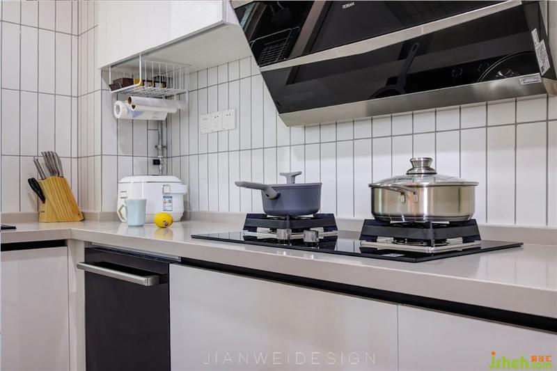 餐廳及廚房比較小,缺少儲物空間。在這里,設(shè)計師巧用廚房墻體厚度,做成櫥柜,不僅滿足了屋主的愛好習(xí)慣,還一并解決了儲物問題。