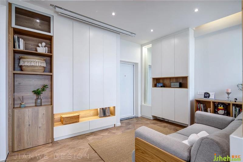 幕布后面設(shè)計了白色收納柜,盡量增加儲物空間,讓墻面的視覺更簡潔利落