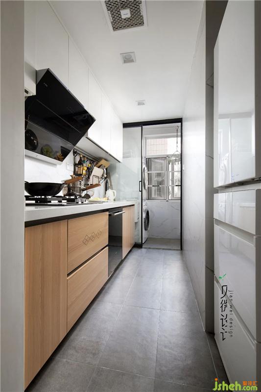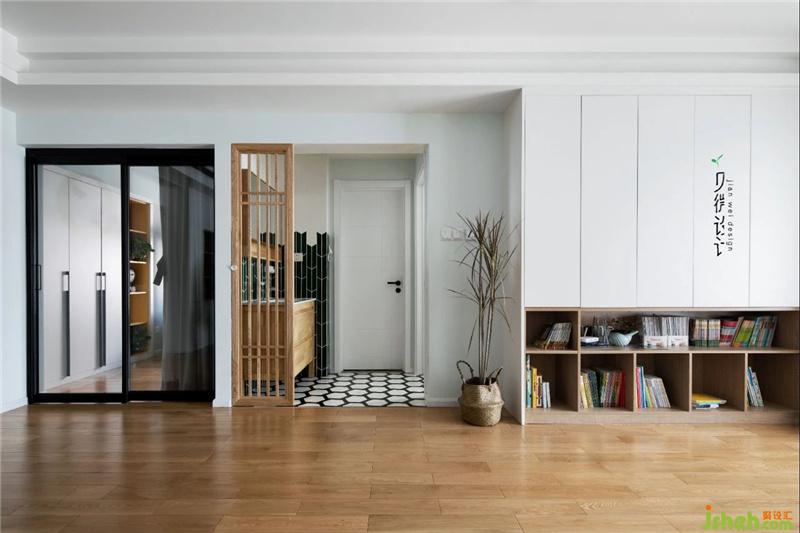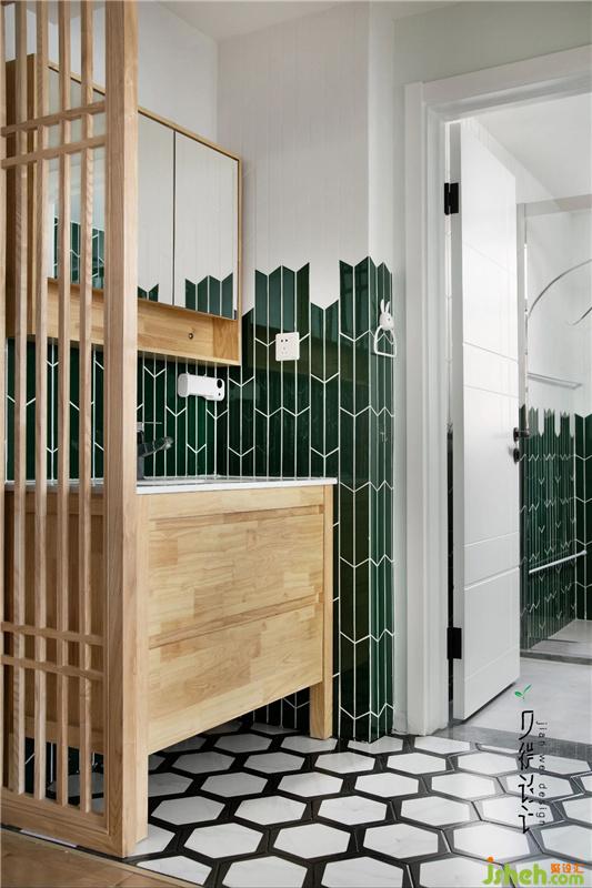 過道空間巧妙利用,空間干濕分離,木質(zhì)屏風與綠色瓷磚結(jié)合營造小森林的意境