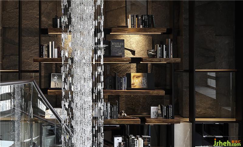 起居室作為整體空間的核心,運(yùn)用挑空的建筑優(yōu)勢(shì),搭配落地窗,創(chuàng)造廣闊的視野。地坪采圓形幾何分割,材質(zhì)精巧,搭配優(yōu)雅的弧形旋轉(zhuǎn)梯,盤繞于6米高的水晶燈由天花板,延續(xù)至整個(gè)空間創(chuàng)造大宅的氣度正式性。左右兩側(cè)高聳的書墻,挑高梁帶利用鏡面分割空間放大與修飾梁帶線條,鐵件搭配實(shí)木,光線安排讓整體書墻更精致。梁帶使用石材及劈面石材互相搭配,凸顯變化與空間肌理。書墻搭配后方預(yù)設(shè)的通道,使視覺層次提高,讓人可靠著俯視,呈現(xiàn)