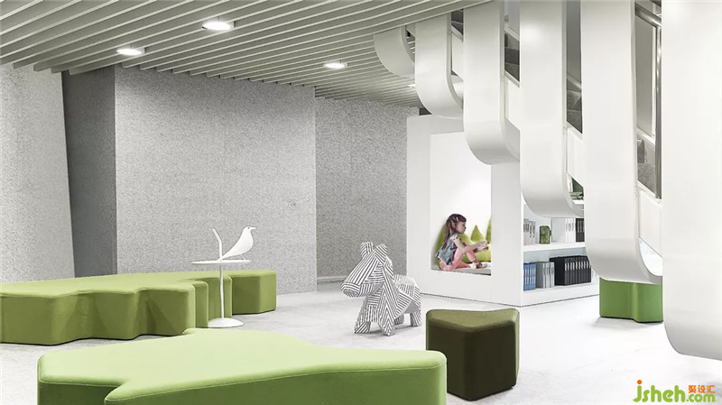 ▼在二層還設(shè)置了一些相對安靜的活動區(qū)域,包括閱讀區(qū)等內(nèi)容
