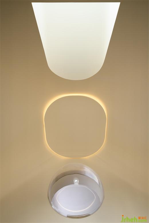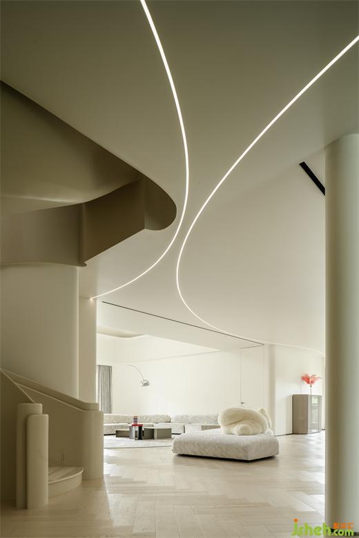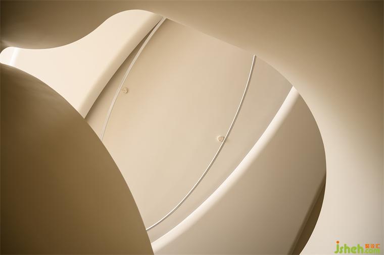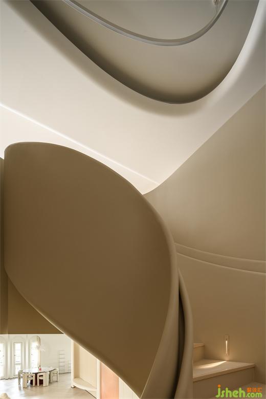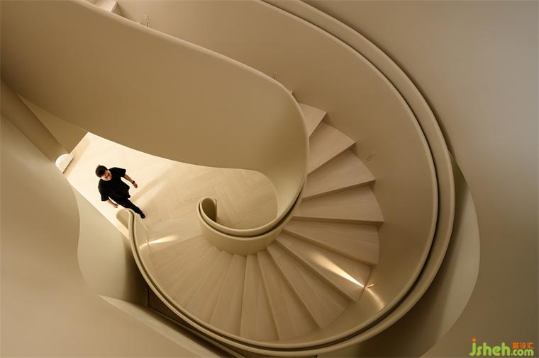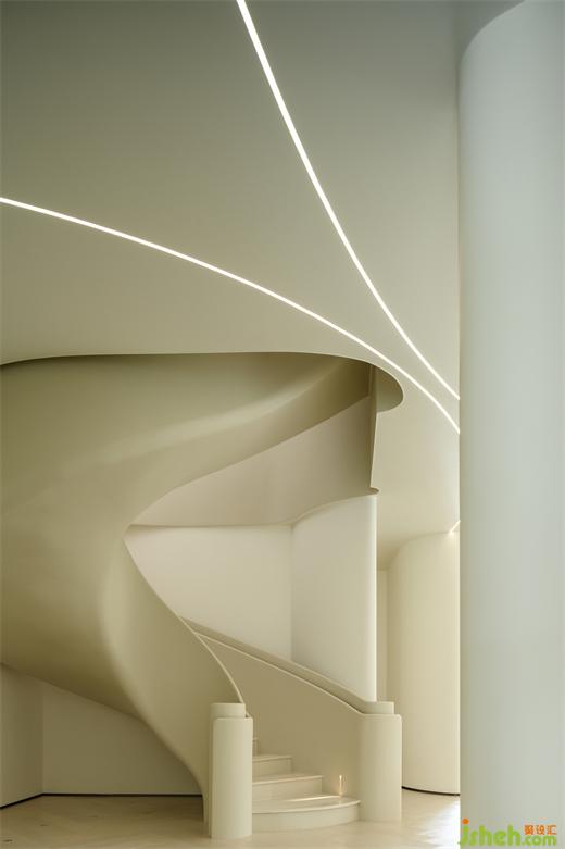核心處異形旋轉(zhuǎn)樓梯圓潤(rùn)的弧線輕巧的勾連起上下樓層之間的界限。