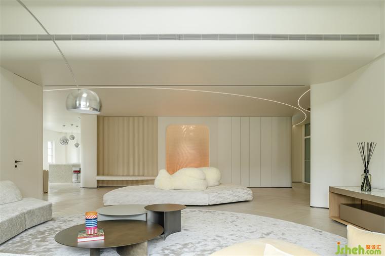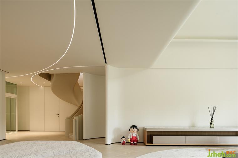 別墅設(shè)計(jì)師運(yùn)用柔和曲線作為基礎(chǔ)設(shè)計(jì)語(yǔ)言,空間中也大多以弧形落筆,巧妙地通過(guò)光線和結(jié)構(gòu),讓空間呈現(xiàn)出獨(dú)特的視覺(jué)張力。
